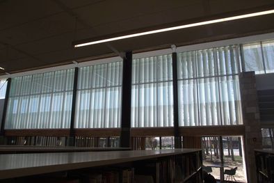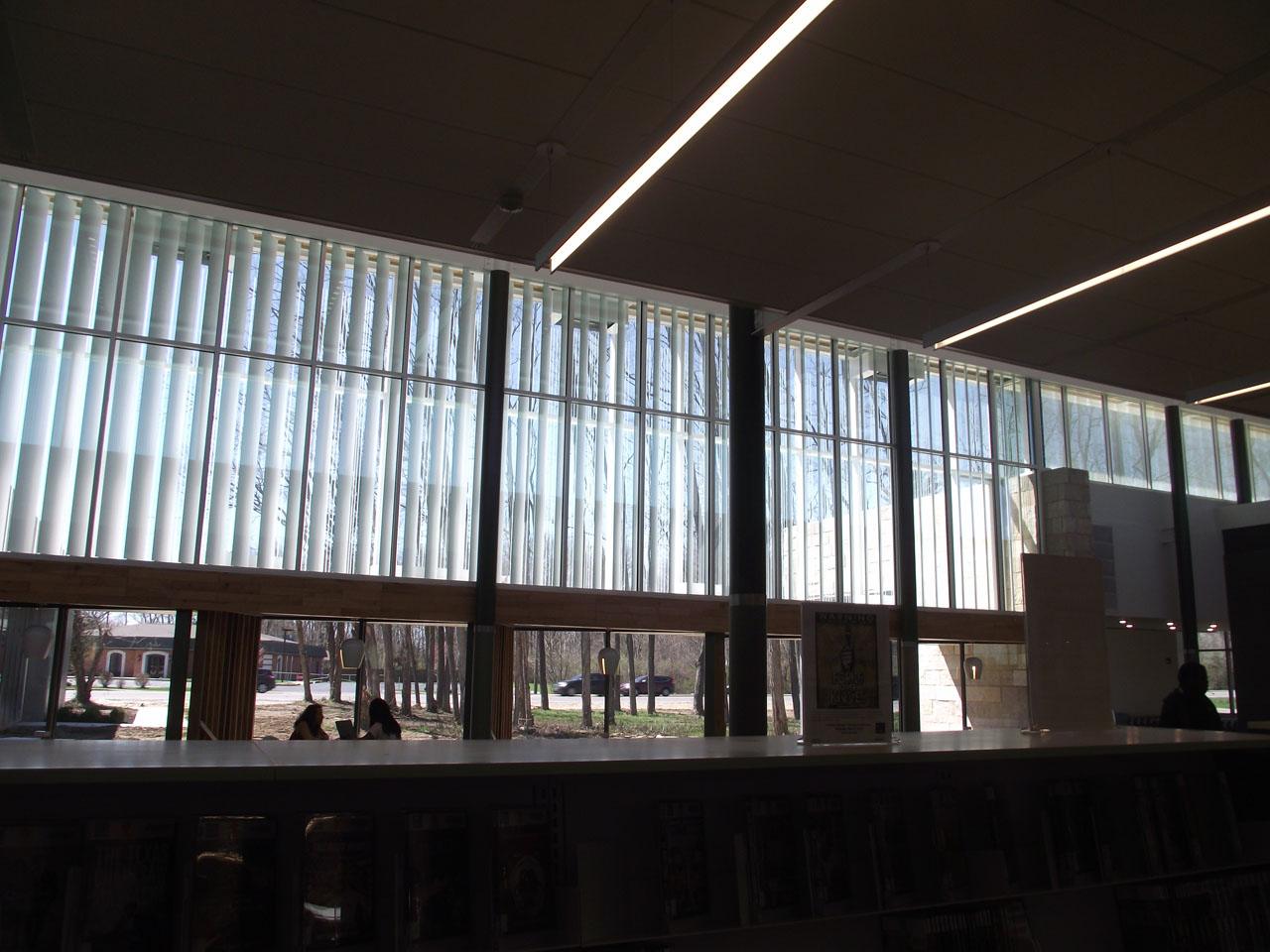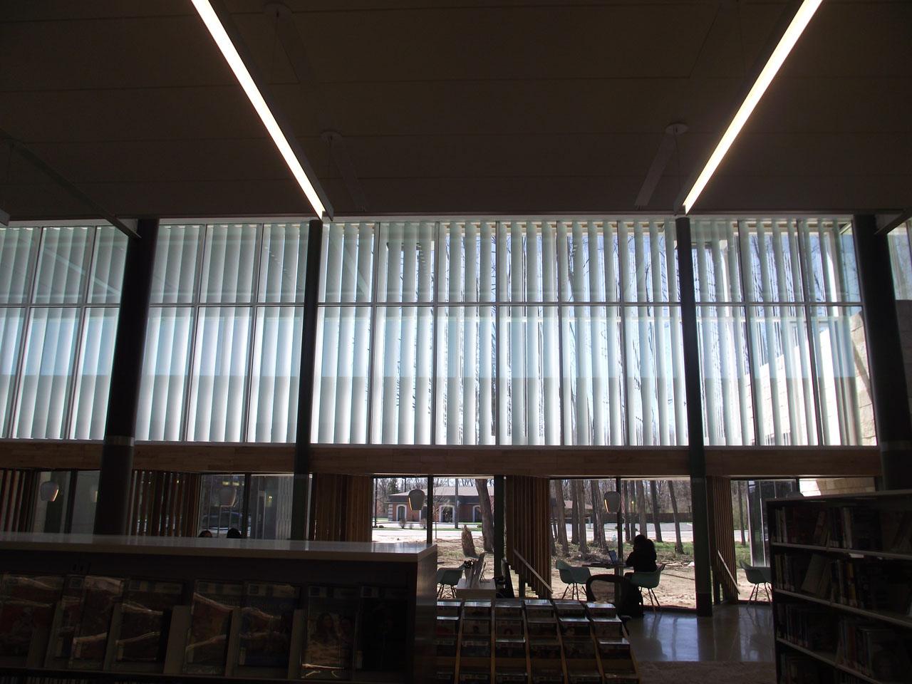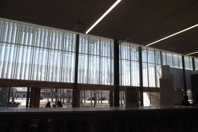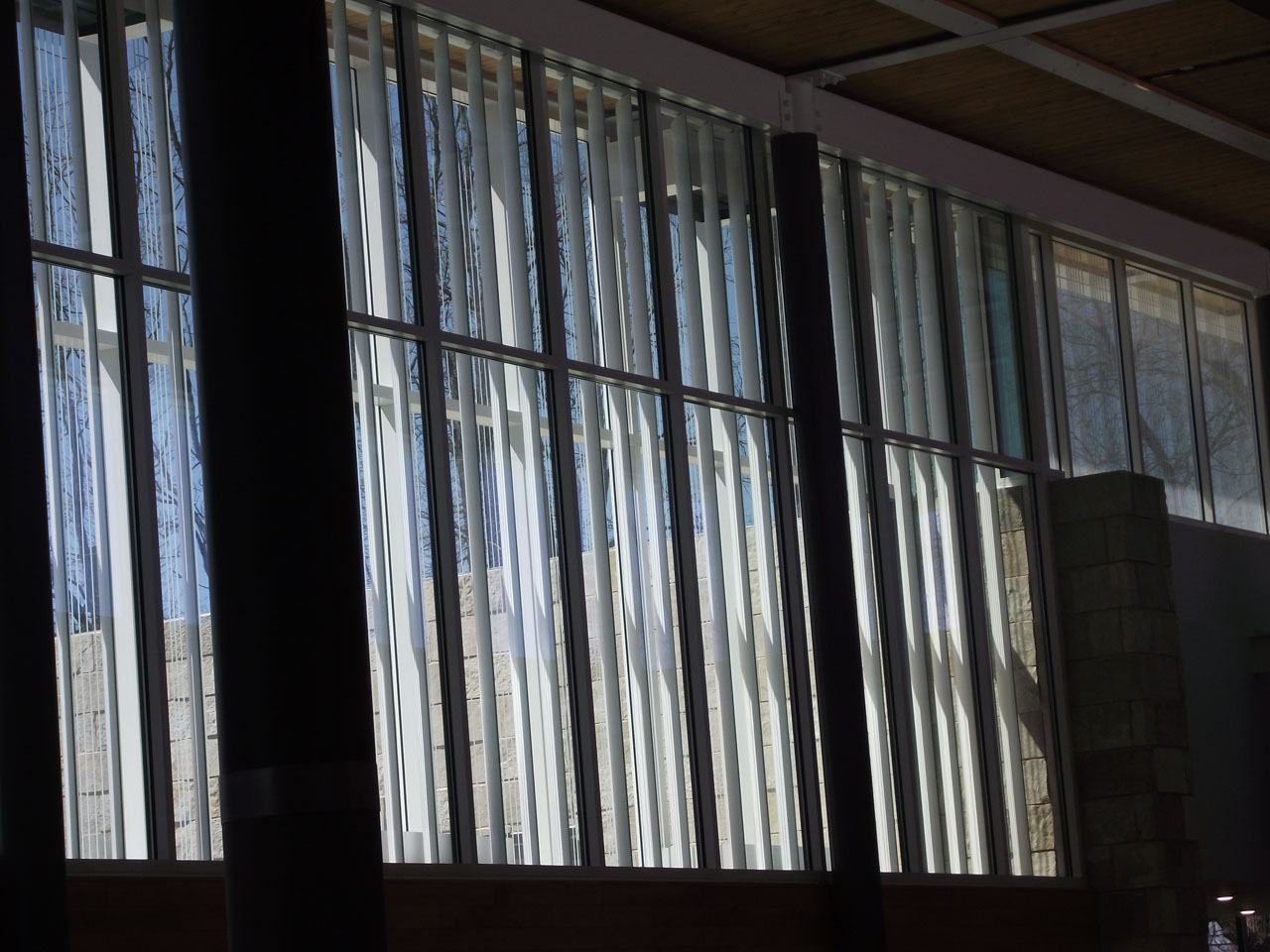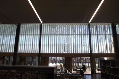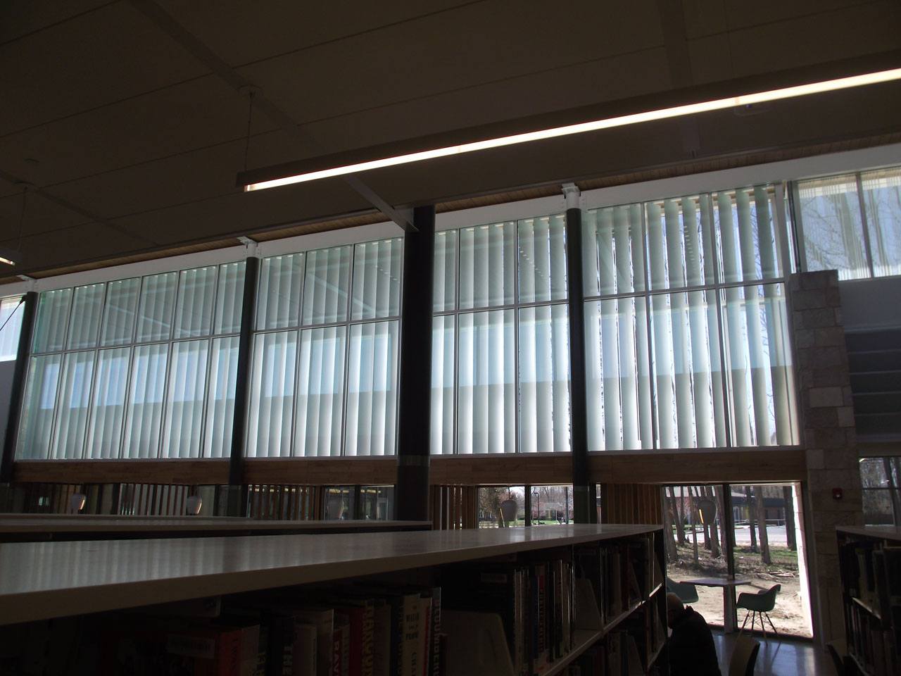 Sonnenstandgeführter Alu-Lamellen Sonnenschutz für den Fassadenzwischenraum der Westfassade der Bibliothek, angeordnet im oberen Raumbereich. Das Lamellensystem deckt mit 60 Lamellen, einer Lamellenbreite von 300mm und einer Höhe von 4.000mm, eine Länge von 18m ab. Die vollständig opaken Lamellen verhindern Strahlungs- und Lichtdurchtritt und vermeiden Überhitzung so wie Blendung. Sämtliche Lamellen verfahren synchron. Der Betrieb hat lautlos zu erfolgen. Spielfreie Lamellenmechanik ist zu gewährleisten.