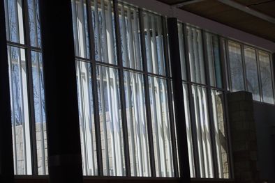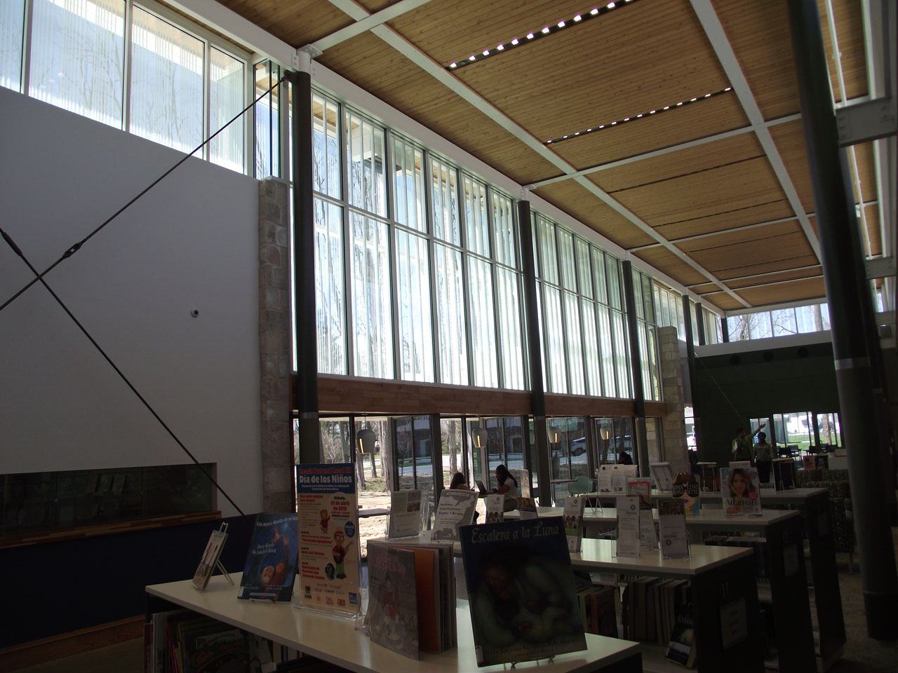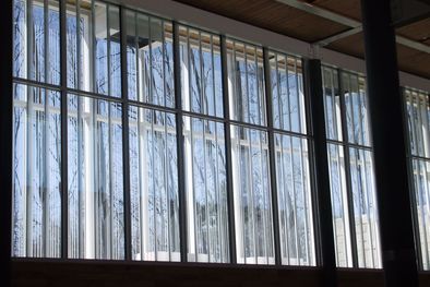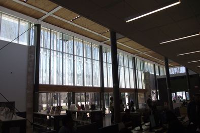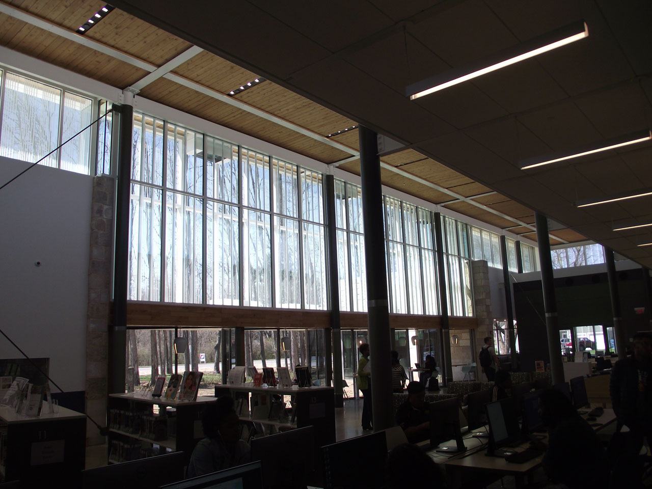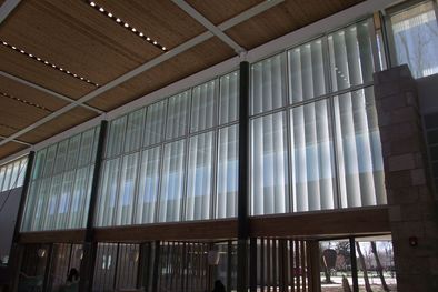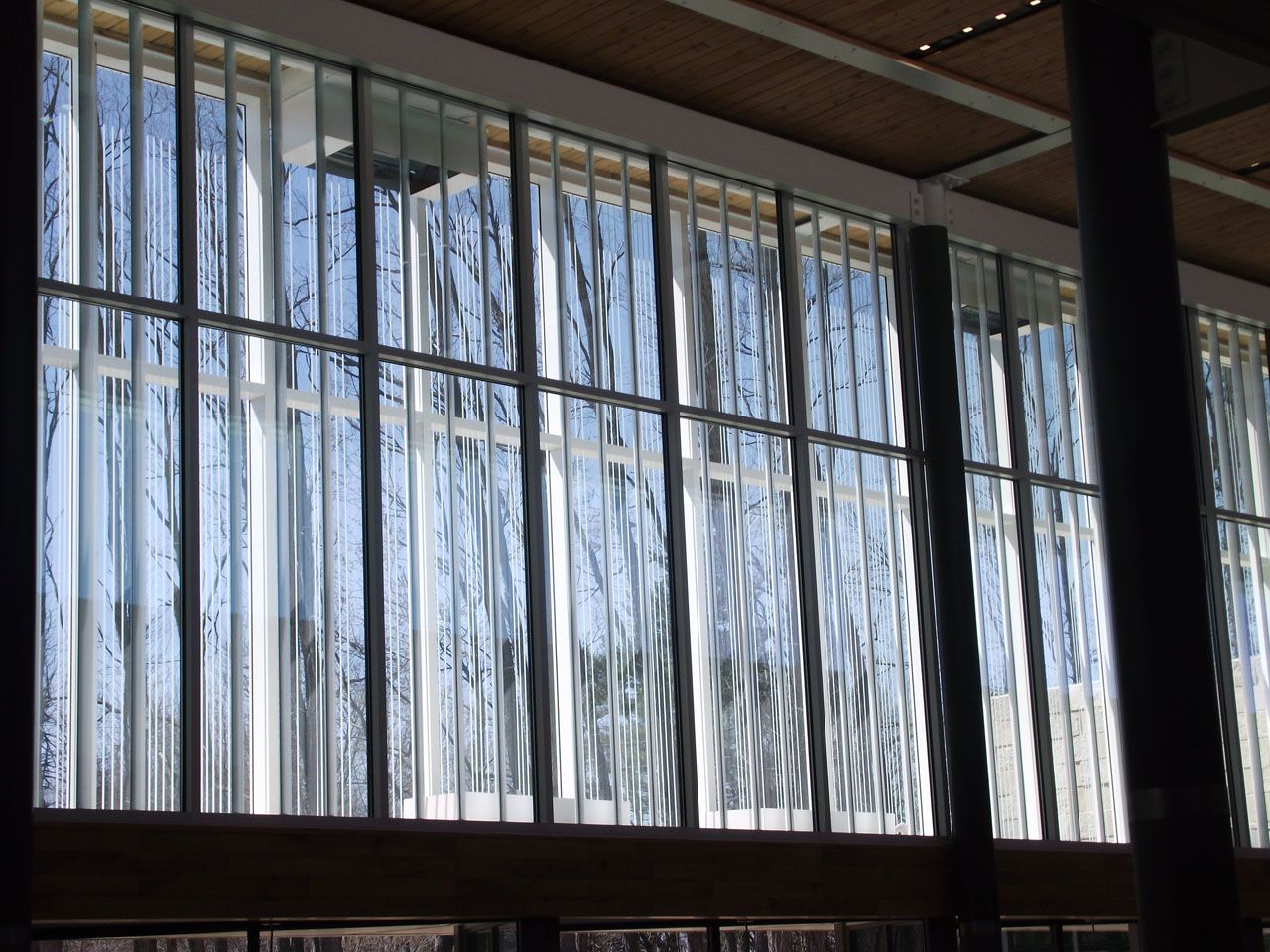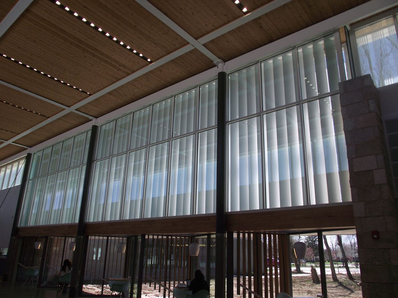 Sonnenstandgeführter Alu-Lamellen Sonnenschutz für den Fassadenzwischenraum der Westfassade der Bibliothek, angeordnet im oberen Raumbereich. Das Lamellensystem deckt mit 60 Lamellen, einer Lamellenbreite von 300mm und einer Höhe von 4.000mm, eine Länge von 18m ab. Die vollständig opaken Lamellen verhindern Strahlungs- und Lichtdurchtritt und vermeiden Überhitzung so wie Blendung. Sämtliche Lamellen verfahren synchron. Der Betrieb hat lautlos zu erfolgen. Spielfreie Lamellenmechanik ist zu gewährleisten.