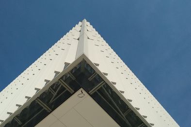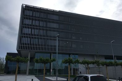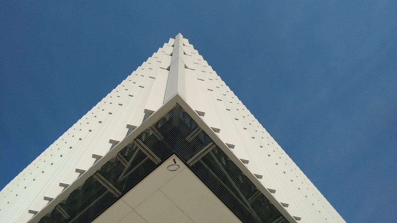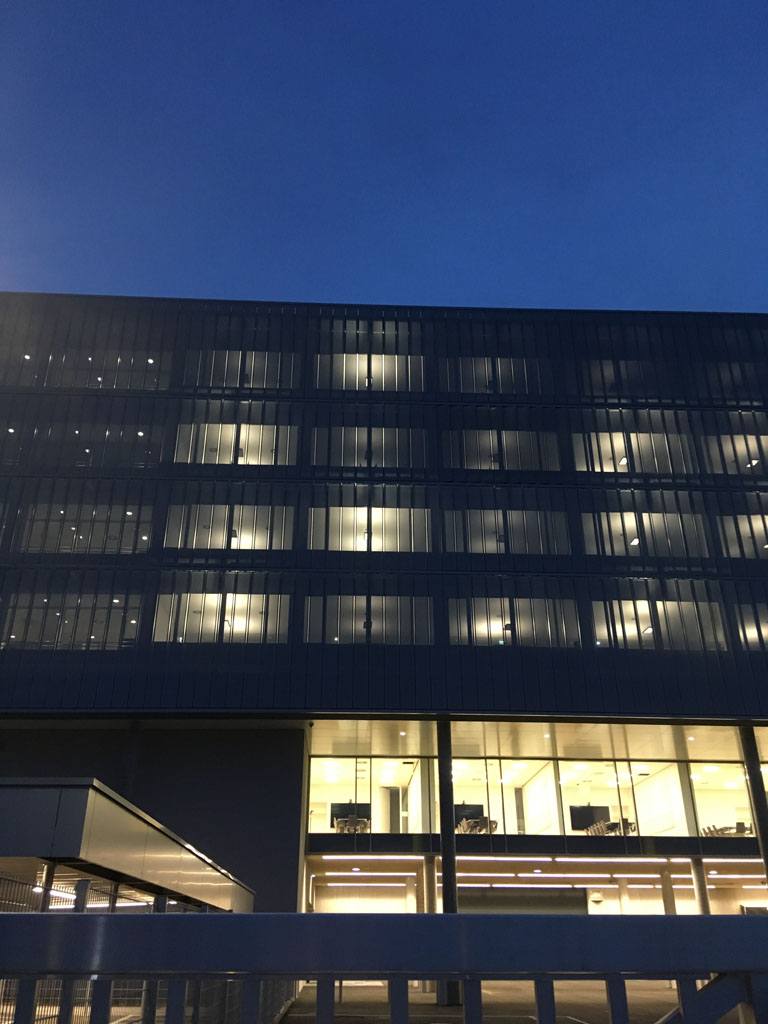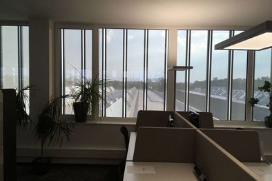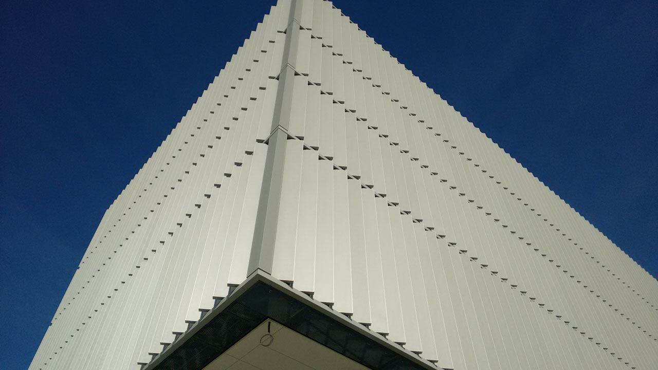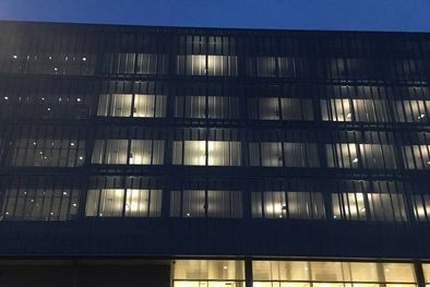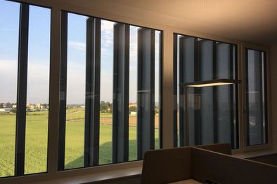 Die Entscheidung fiel zugunsten eines sonnenstangeführten, drehbaren Lamellenvorhangs aus perforierten und beschichteten Alu-Blechen, angeordnet als Vertikallamellen. Sämtliche Lamellen verfahren synchron. Das intelligente Steuerungskonzept von Elconeq stellt präzise Nachführung sicher und ermöglicht raumabschnittsweise manuelles Eingreifen. Mit nur einer ‚Steuerintelligenz‘ werden gleichzeitig alle Etagen sowie alle Fassadenabschnitte bedient. Je nach Sonnenstand wird jede beliebige Fassade optimal verschattet oder Tageslicht in die Räume geleitet.