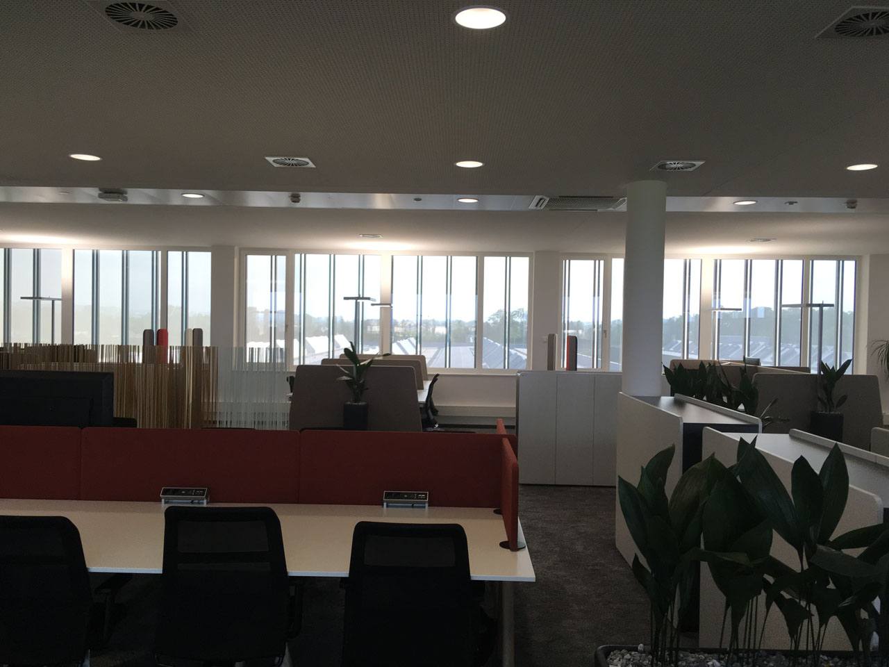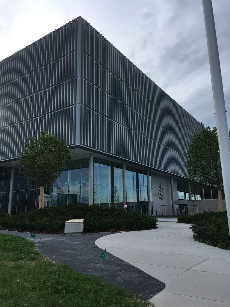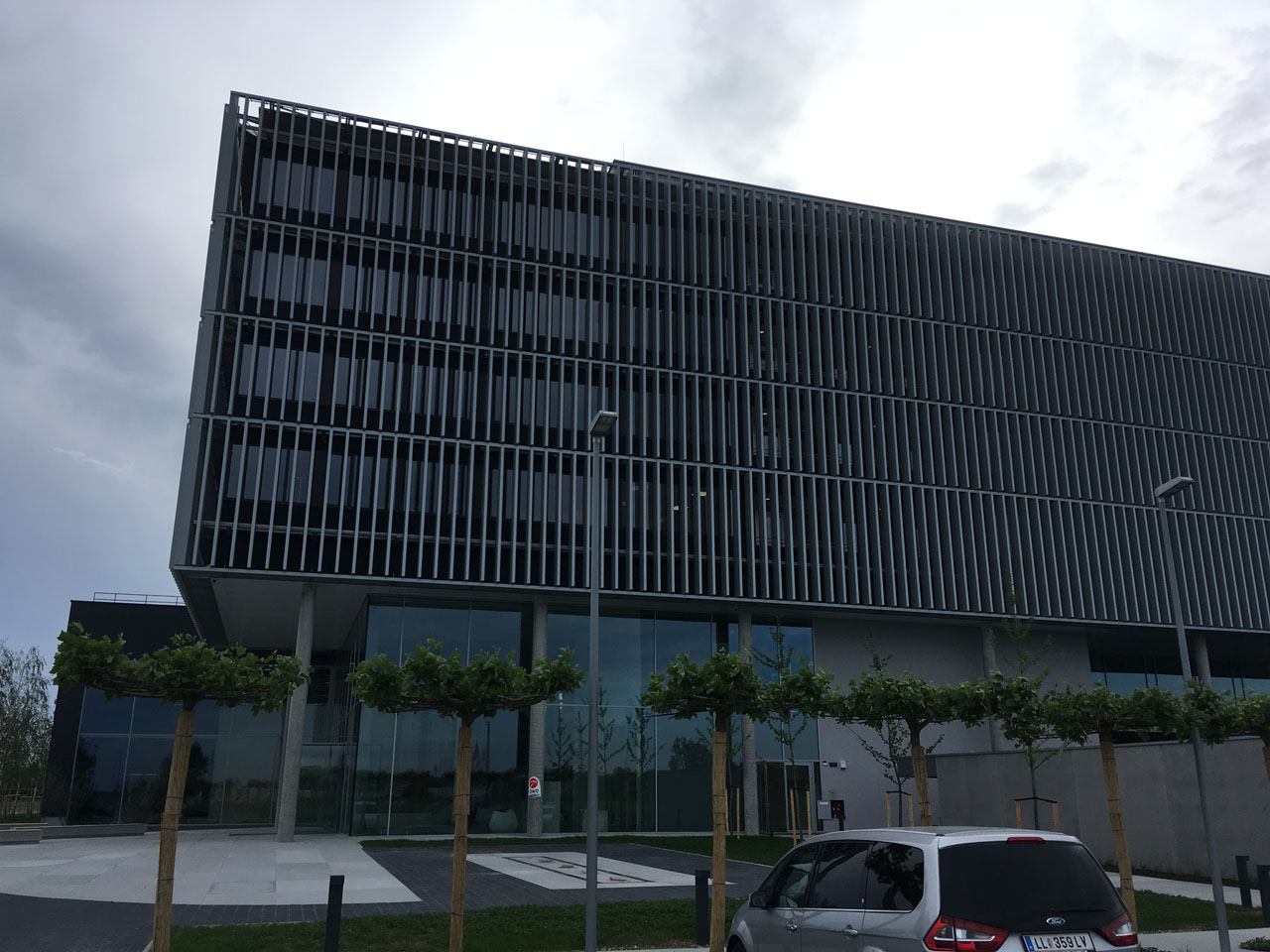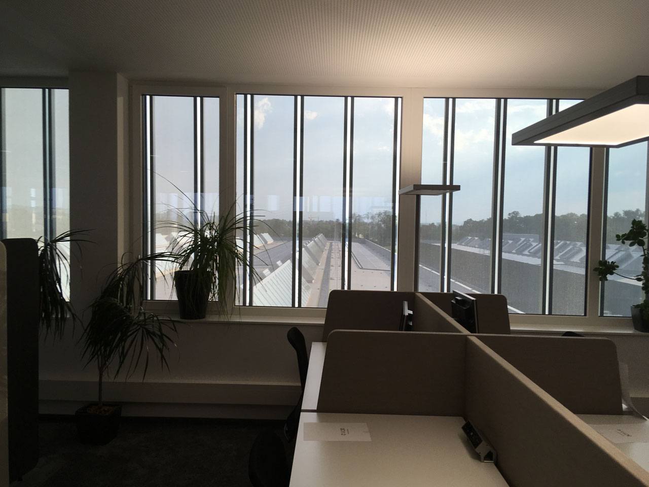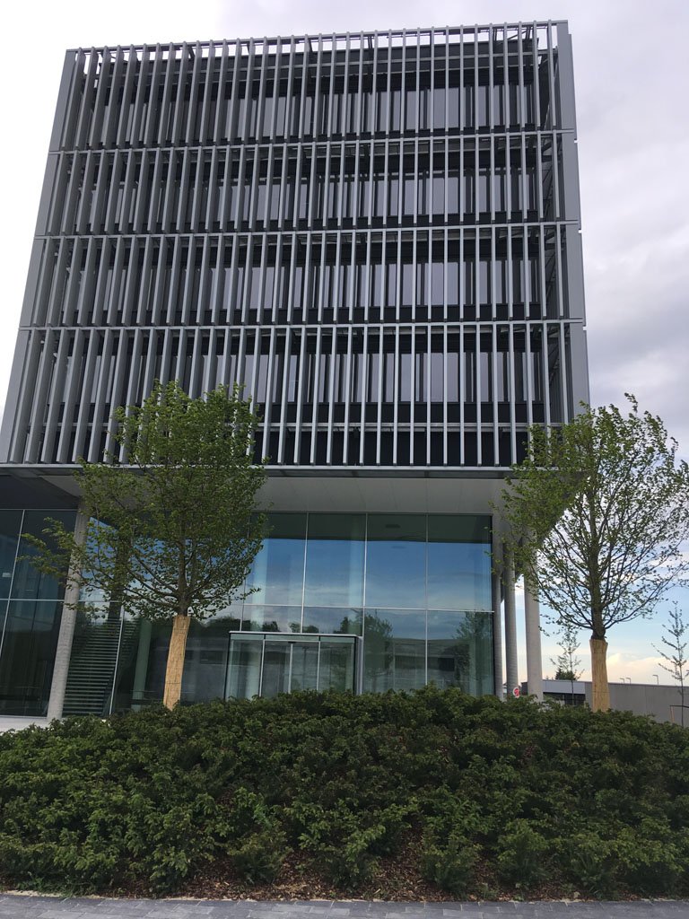 Sonnenstandgeführter Alu-Lamellen Sonnenschutz, fassadenvorgesetzt und angeordnet auf 4 Etagen sowie umlaufend auf allen 4 Fassaden, soll die erheblichen Wärmelasten der transparenten Gebäudehülle effizient reduzieren. Gleichzeitig soll eine Teiltransparenz der Lamellen Durchsicht und Tageslichtgewinn sicherstellen. Eine austarierte Balance von sommerlichen Wärmeschutz und Tageslichtgewinn wurde angestrebt. Gleichzeitig gilt es, Architektur und Gebäudeästhetik in Szene zu setzen.