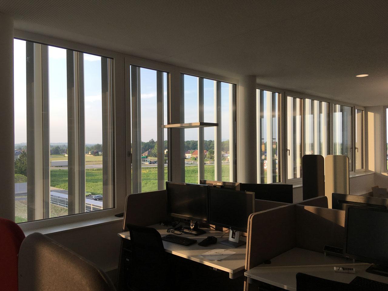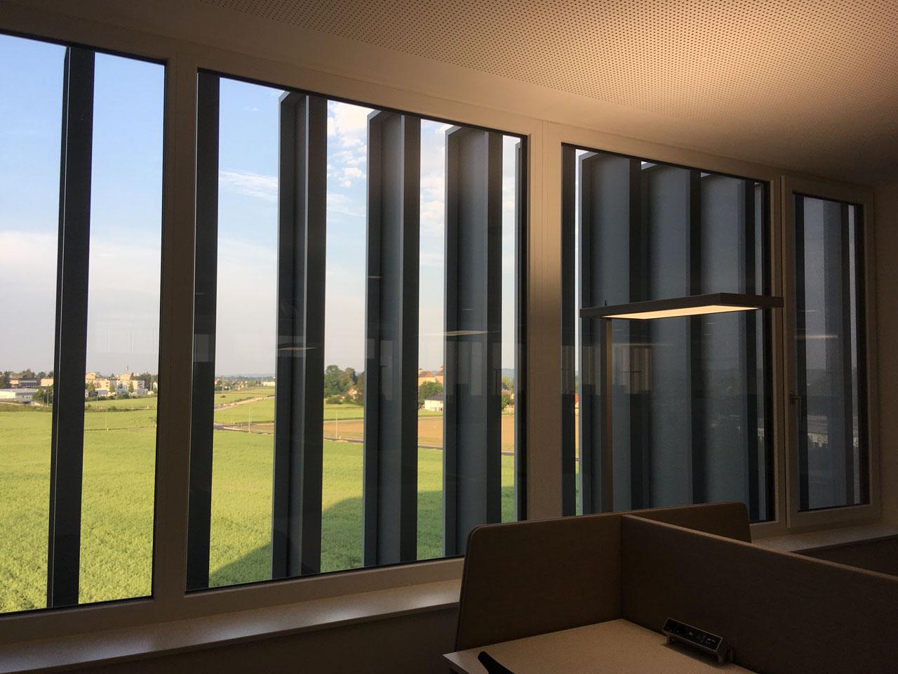 Vertikale und automatische nachgeführte Lamellen dominieren optisch das Bild am neuen Evolution Park der Fa. TGW. Alle 4 Fassaden sind ganzflächig mit dem beweglichen Sonnenschutz ausgestattet. Fast 200 Motoren sorgen für perfekte Beschattung und eine präzise Lamellennachführung und synchrone Gleichstellung. Keine alltägliche Herausforderung, die die SMEConcept von Elconeq mit Bravour meistert. Die Steuerung ist in Etagen-, Fassadenabschnittenund der Raumnutzung gemäß in entsprechenden Gruppen unterteilt.